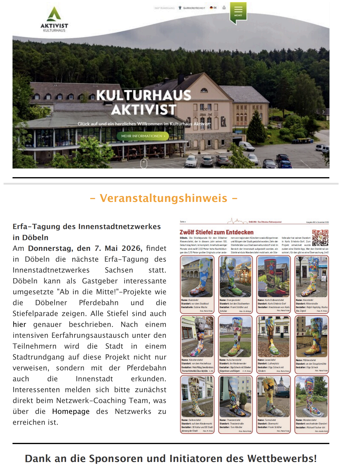Der Newsletter lädt zur Auftaktveranstaltung am 4. März 2026 im Kulturhaus AKTIVIST in Aue-Bad Schlema ein, bei der Schirmherr Staatsminister Dirk Panter das neue Jahresmotto bekanntgeben wird. Im Input-Vortrag beschäftigt sich Autorin Greta Taubert mit der Frage, ob Innenstadt für alle Raum bietet. Zudem wird auf die Erfa-Tagung des Innenstadtnetzwerkes am 7. Mai 2026 in Döbeln hingewiesen, wo Projekte wie die Pferdebahn und die Stiefelparade besichtigt werden können.