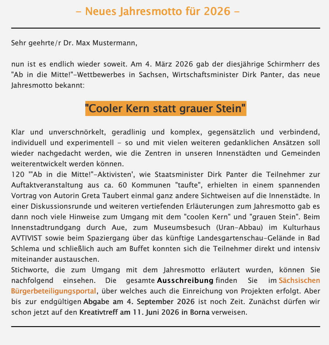 Der Newsletter kündigt das neue Jahresmotto 2026 des sächsischen Innenstadtwettbewerbs „Ab in die Mitte!" an: „Cooler Kern statt grauer Stein" – vorgestellt bei einer Auftaktveranstaltung mit rund 120 Teilnehmern aus 60 Kommunen in Bad Schlema.