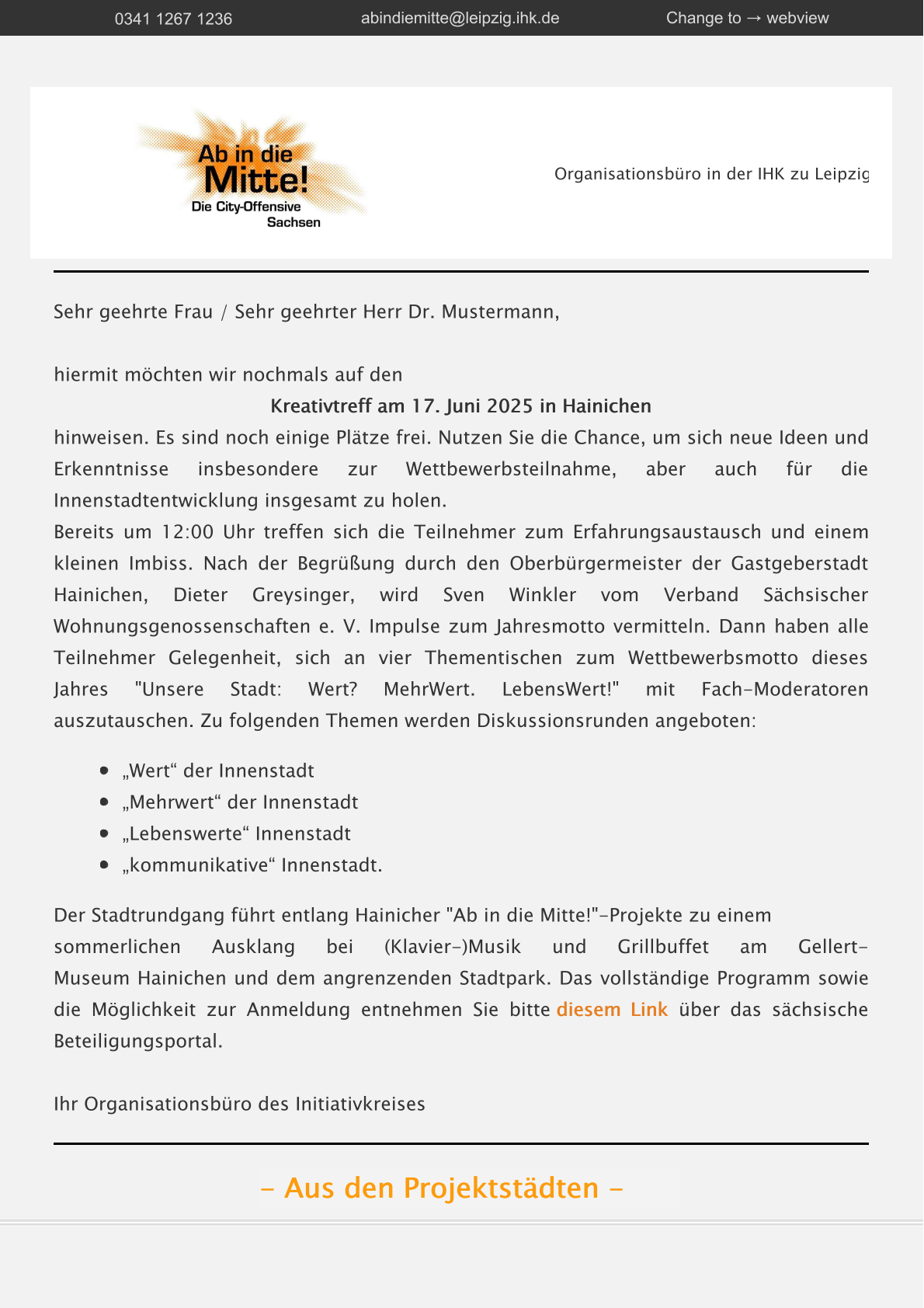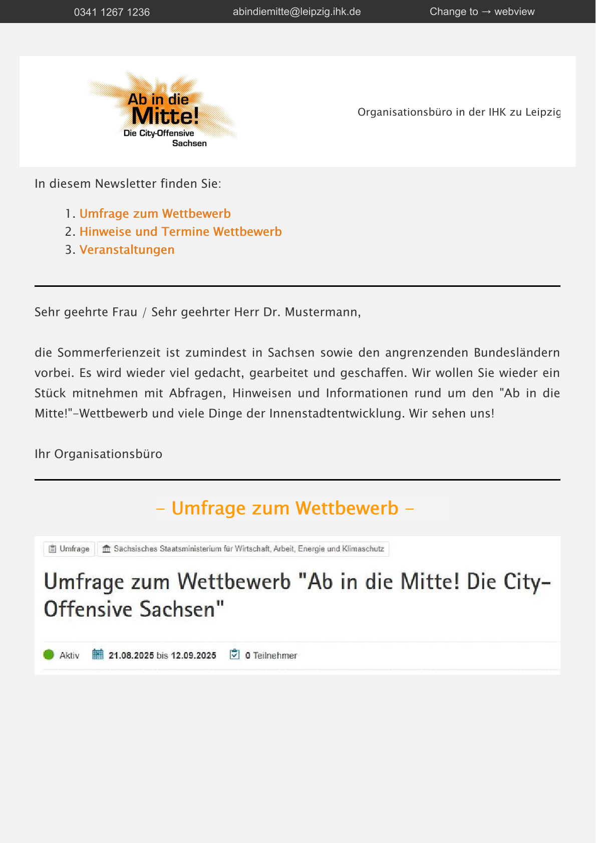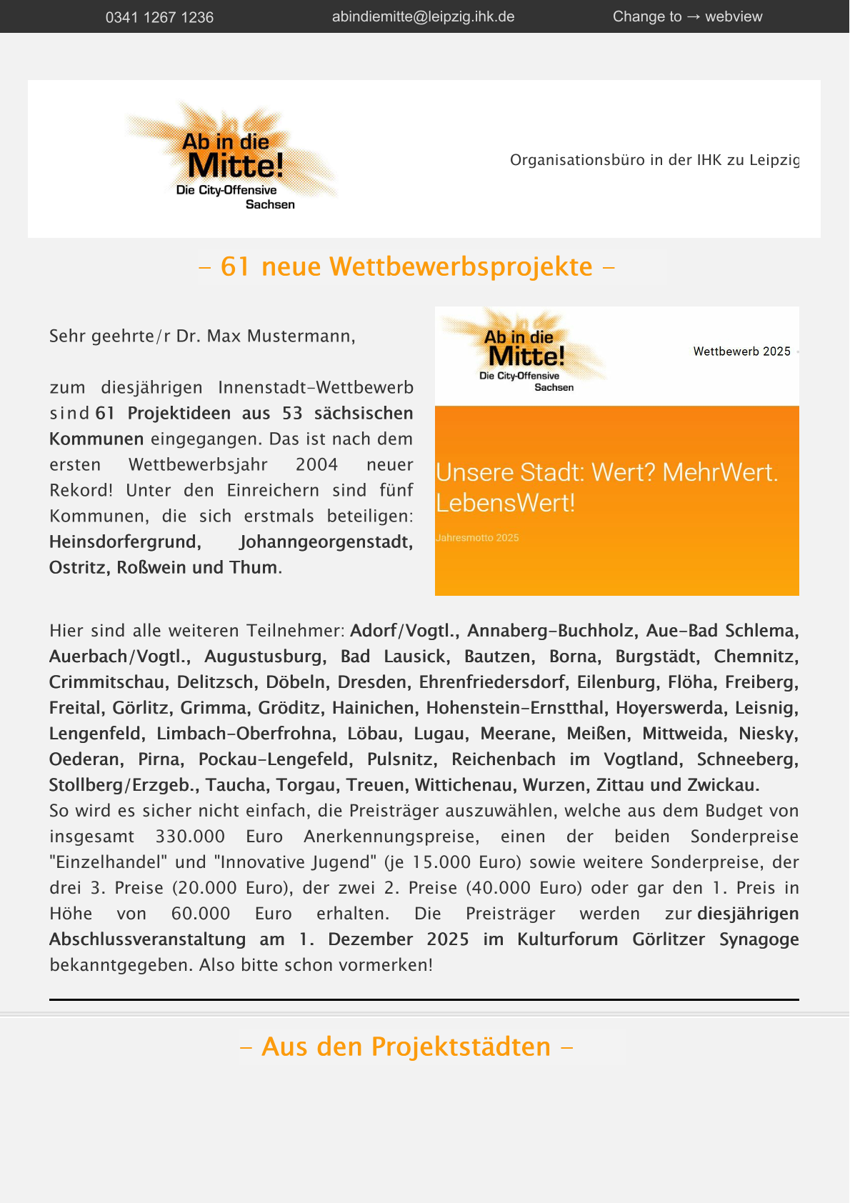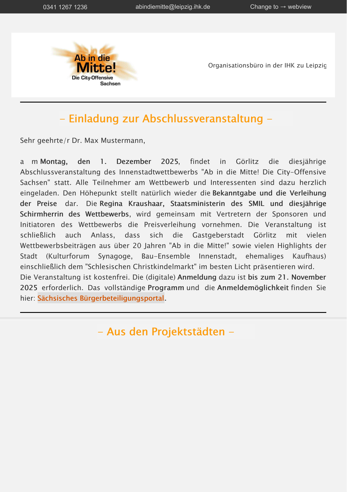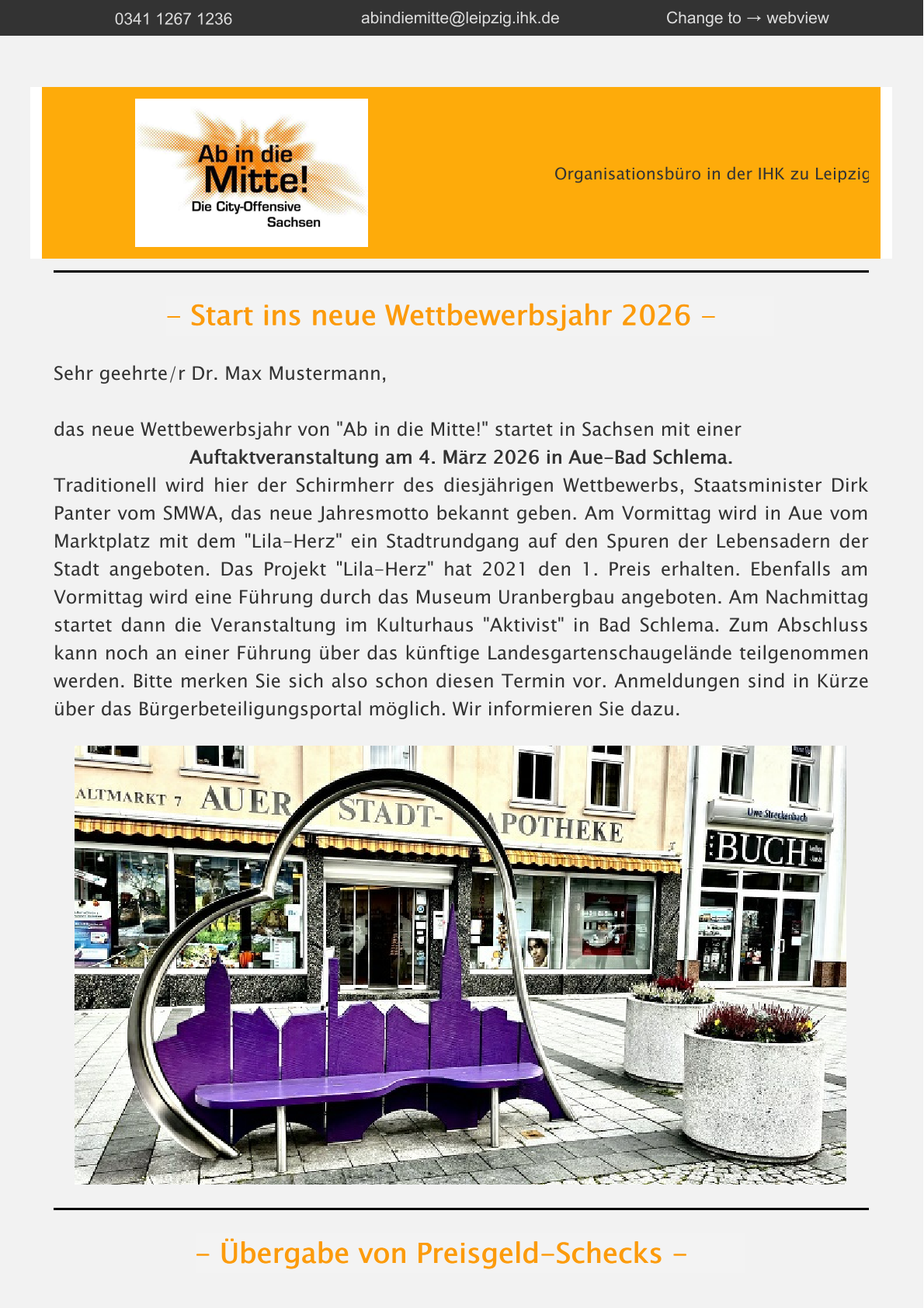 Der Wettbewerb "Ab in die Mitte! Die City-Offensive Sachsen" startet in wenigen Wochen mit der Auftaktveranstaltung für das Wettbewerbsjahr 2025. Dazu möchten wir Sie hiermit herzlich einladen, am 25. März 2025 in die IHK nach Chemnitz zu kommen.