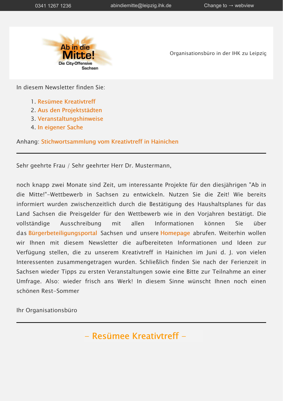 Der Newsletter enthält ein Resümee des Kreativtreffs in Hainichen, bei dem an vier Thementischen Ideen zum Wettbewerbsmotto gesammelt wurden.