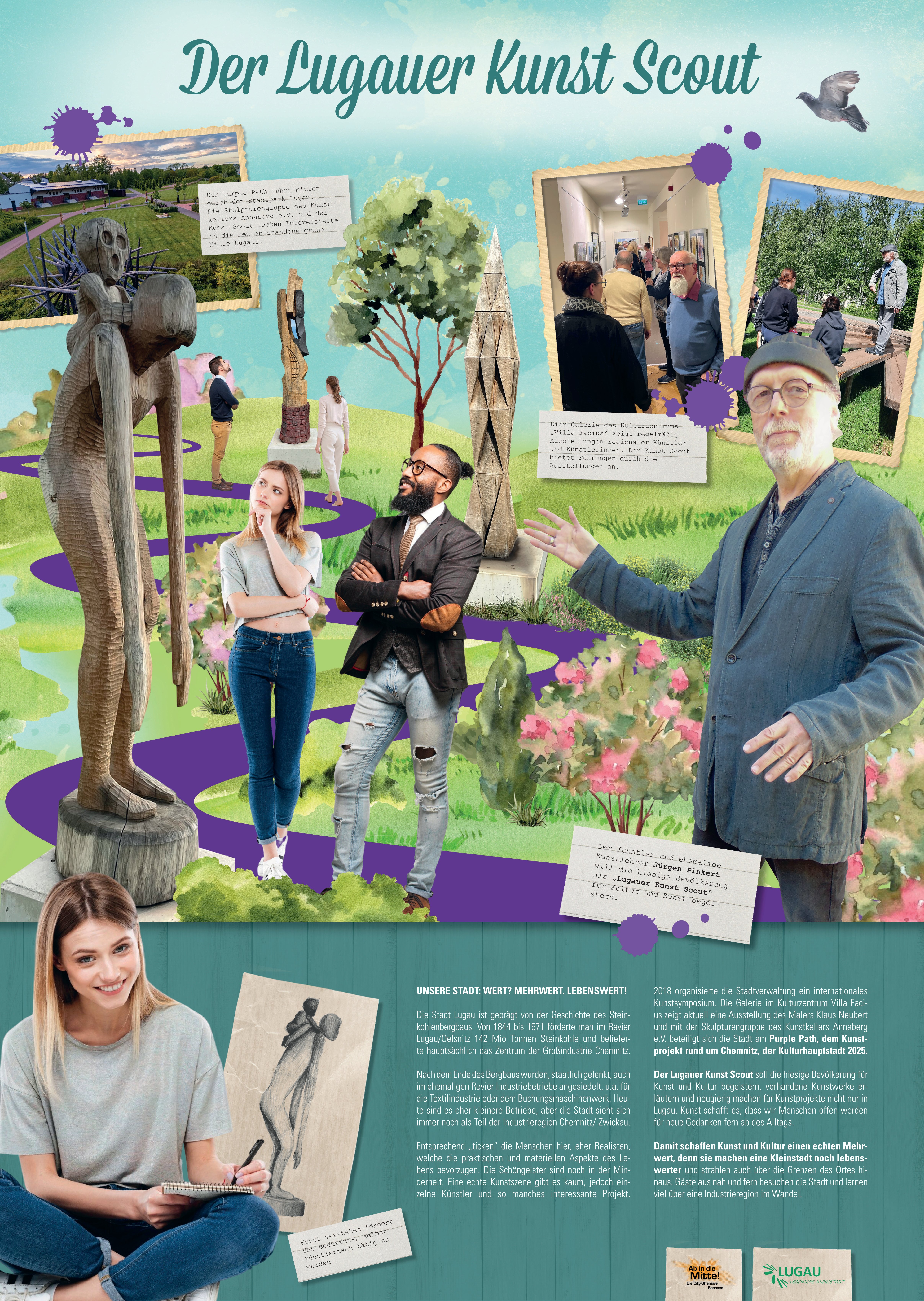 Lugau ist stark von seiner Steinkohlen- und Industrievergangenheit geprägt und versteht sich weiterhin als Teil der Industrieregion Chemnitz/Zwickau. Die Bevölkerung gilt als praktikabel-realistisch; eine größere Kunstszene fehlt, auch wenn einzelne Künstler und Projekte vorhanden sind. Kulturelle Impulse setzen u. a. ein internationales Kunstsymposium (2018), Ausstellungen in der Villa Facius (z. B. Klaus Neubert) und die Teilnahme am „Purple Path“ der Kulturhauptstadt Chemnitz 2025. Der „Lugauer Kunst Scout“ soll vor Ort für Kunst und Kultur begeistern, bestehende Werke erläutern und Neugier auf weitere Projekte wecken. Ziel ist, Menschen für neue Gedanken jenseits des Alltags zu öffnen und kulturelle Teilhabe zu stärken.